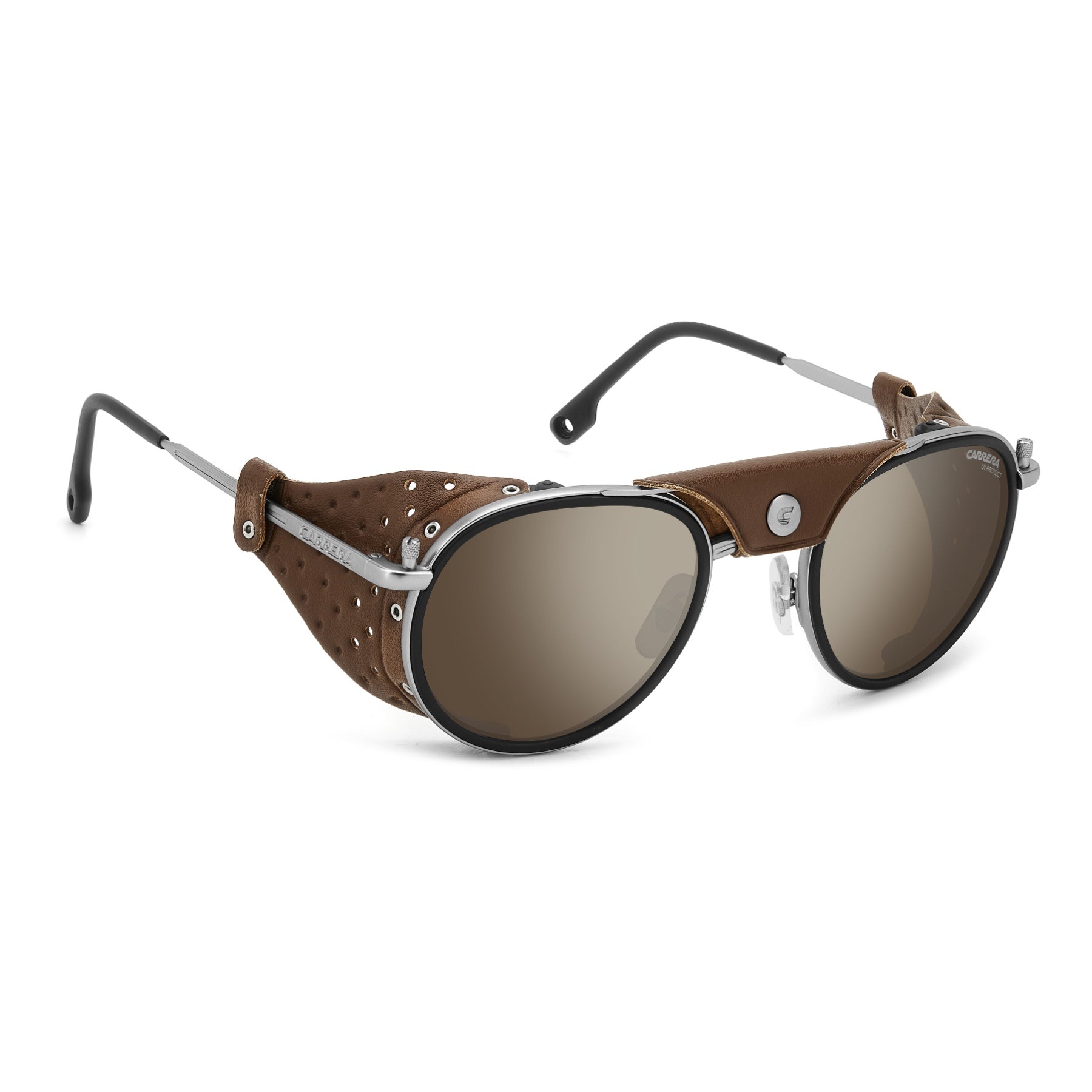 These Carrera sunglasses were inspired by Alpine landscapes. The metal structure is accompanied by detachable faux leather elements on the sides and double bridge which protect from the light and wind. The end tips can be adjusted, remaining solidly in place thanks to their curved shape. Dedicated openings make it possible to attach an elastic cord which can be purchased separately, so as not to lose them on the most arduous climbs. This style is available in mirrored or photochromic lens versions.